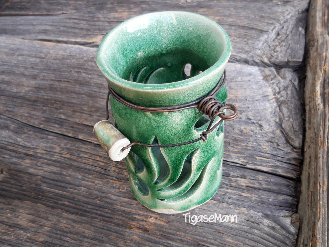 Rohelise krakleeglasuuriga kaetud küünlalatern, millele lisab vürtsi vasktraadist sang. Hämaruses kumab küünlavalgus kaunilt läbi lõigatud mustriavauste.