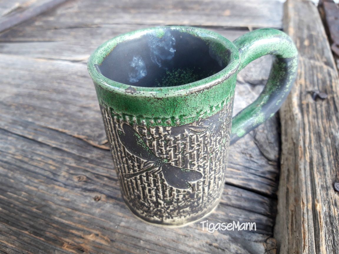 Reljeefse mustriga ja rohelise krakleeglasuuriga kaetud kiilimustriga tassid.