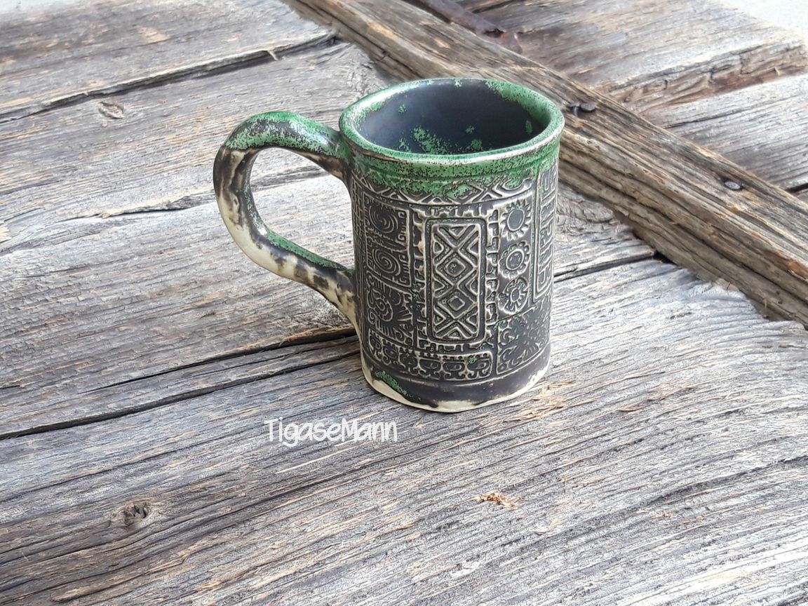 Reljeefse mustriga ja rohelise krakleeglasuuriga kaetud tass.