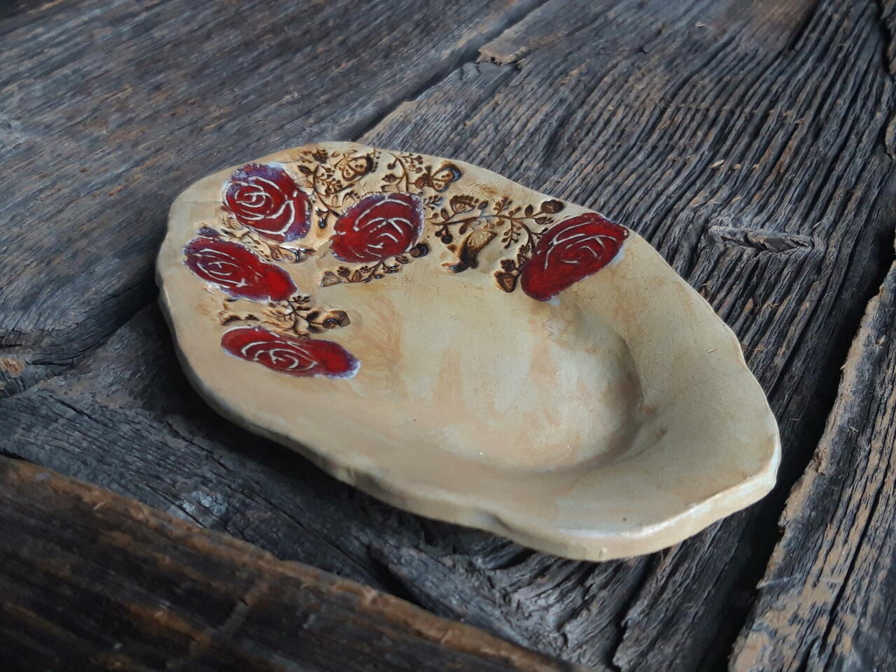 Väike ovaalne rooside ja väätide kujutistega vaagen.