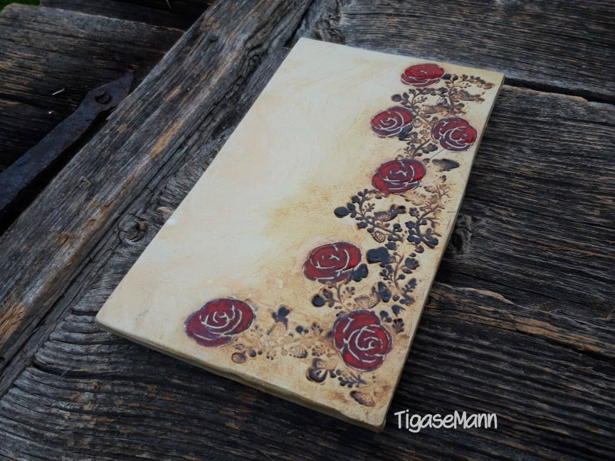 Hele madal serveerimisalus tumepunaste rooside ja pruunide väätidega.