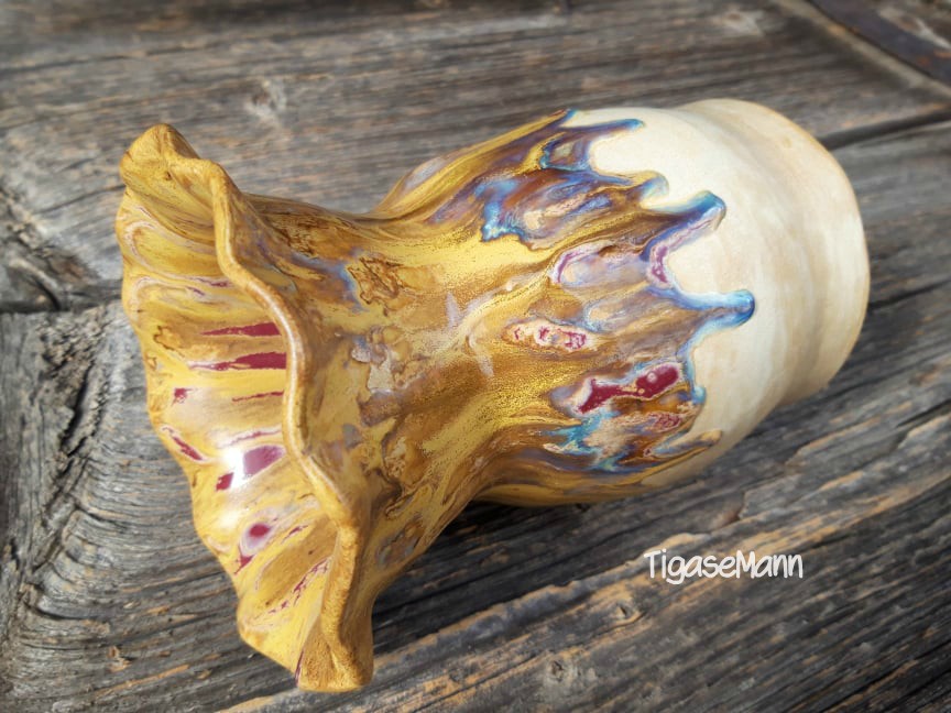 Mõnusalt pontsakas ja kelmikalt kirju vaas.Valminud käsitööna Eestis.Kõrgkuumuskeraamika.Mõõdud:kõrgus 17 cm;laius 13 cm.