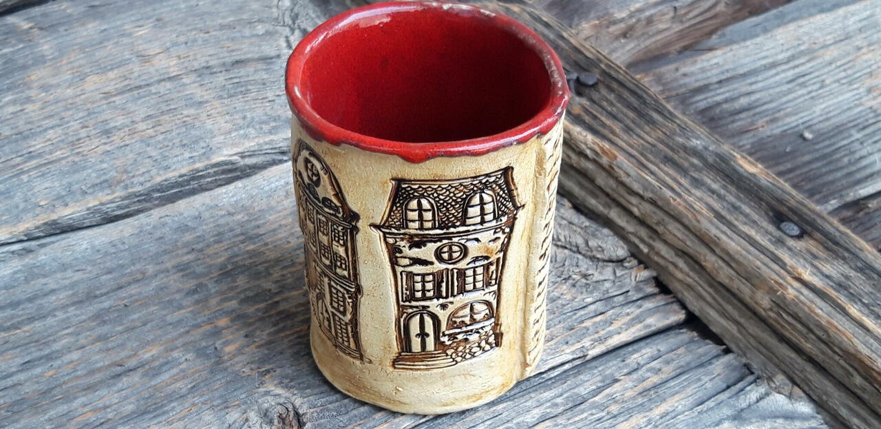 Seest punane majamustriga sangata tass. Mõnus käes hoida ja sõrmi soojendada.