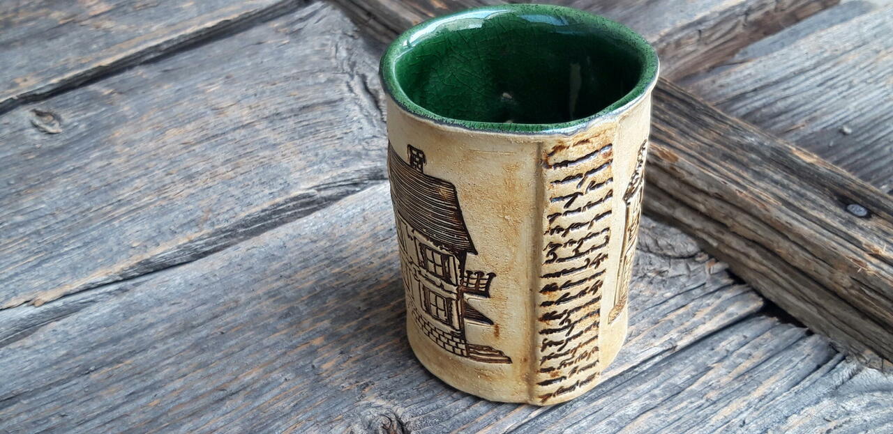 Seest rohekas majamustriga sangata tass. Mõnus käes hoida ja sõrmi soojendada.
