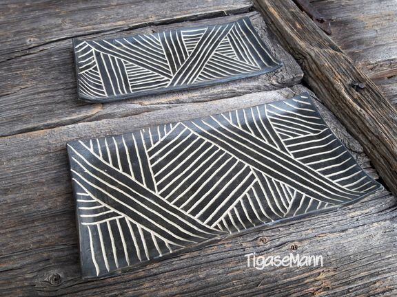 Musta värvi madalad serveerimisalused, mida katab käsitsi joonistatud reljeefne muster.