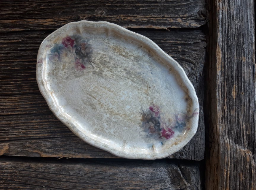 Väike madal valge vaagen, mida kaunistab roosimuster.